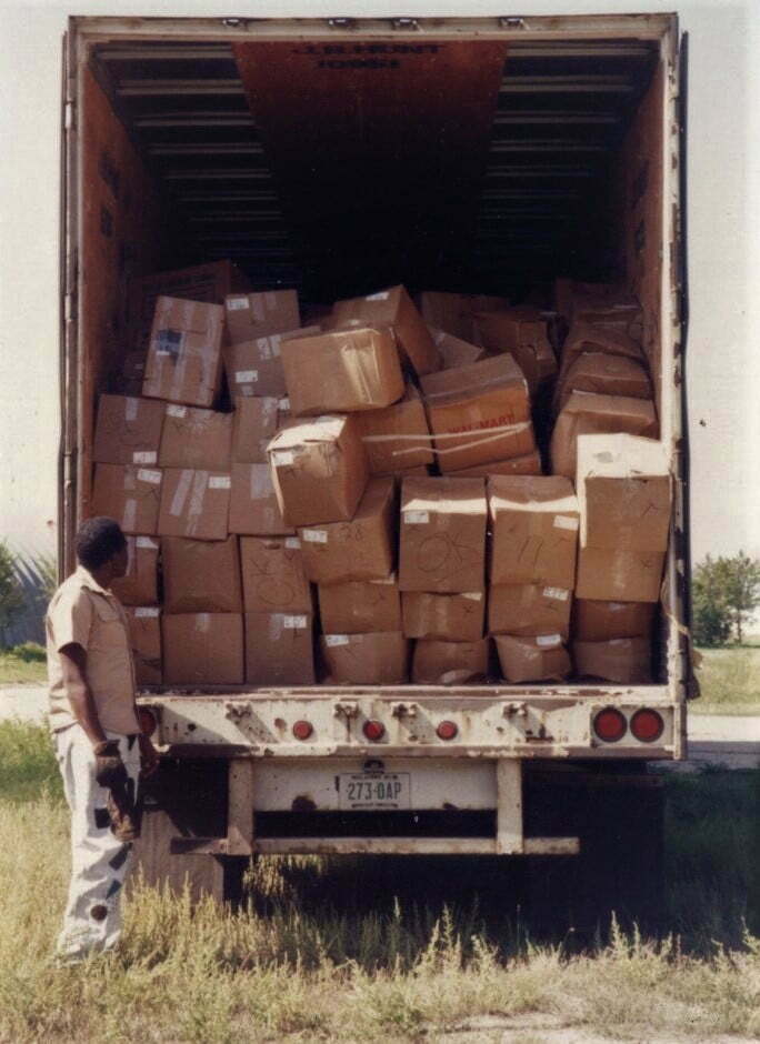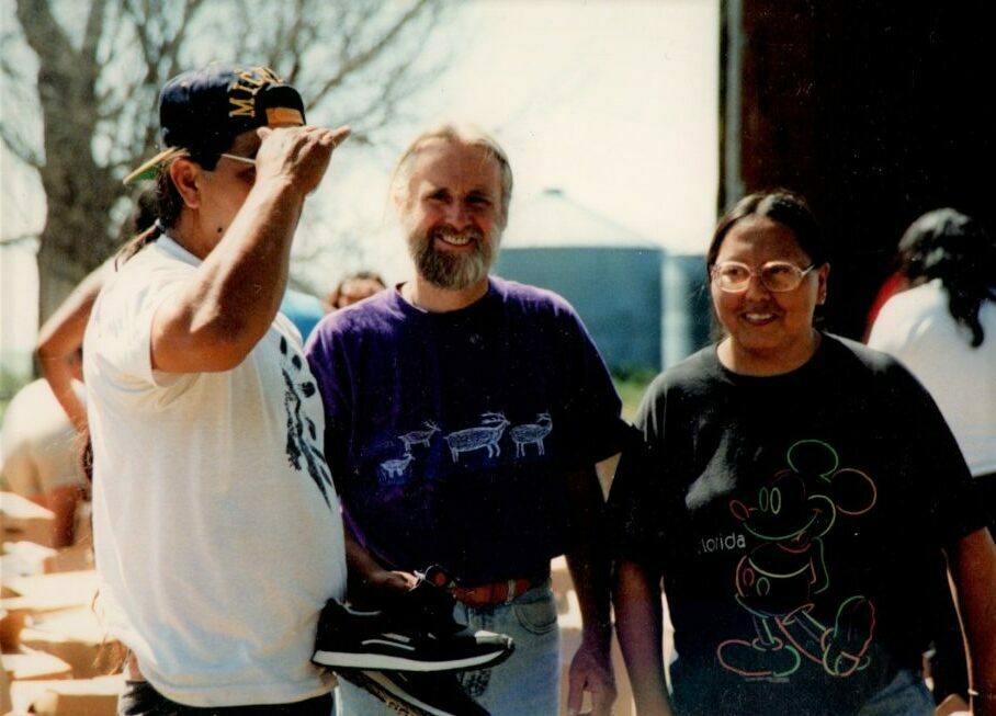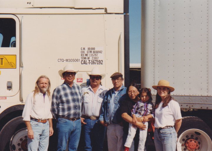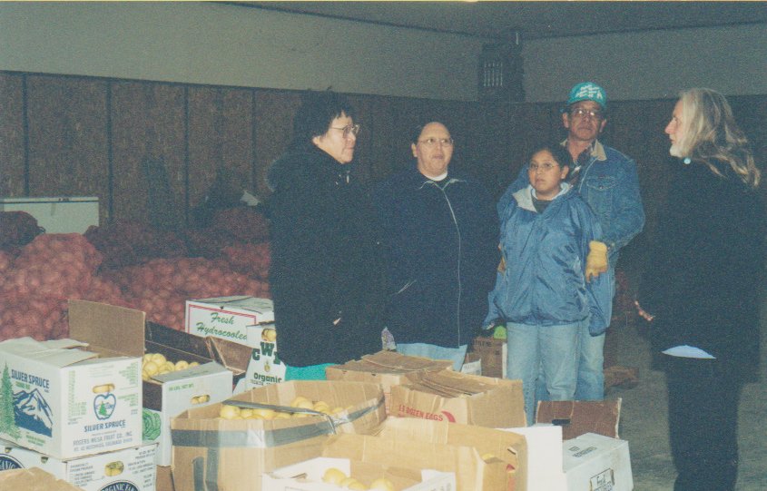 WalMart truck arrived with donated shoes - Dik,, a friend, Chief Mel Lone Hill, Sonny Richards, Geneva Lone Hill & Child, Lynn Weaver.