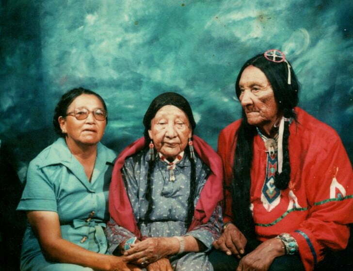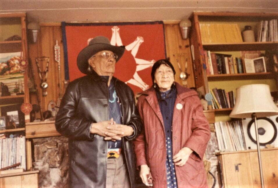 Grandpa Fools Crow and his only child - daughter Marie. Fannie Afraid of Hawk (Grandpa's wife) gave birth to Marie. Marie married Amos Lone Hill who would sing Grandpa's medicine ceremonial songs. The ceremony is called Yuwipi.