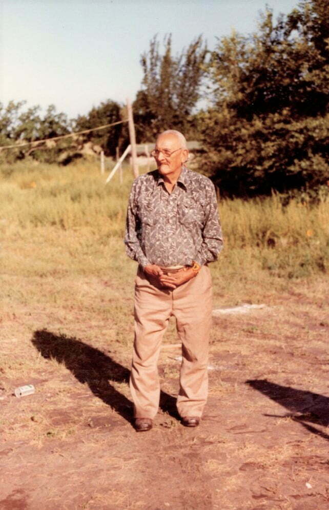 Ninety members of the Big Foot Riders had horses for the pall bearers. We rode behind of the wagon that had Grandpa's casket in. Chief Mel Lone Hill led the procession. We rode five miles to the burial grounds. The burial ceremony was conducted there.