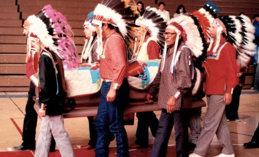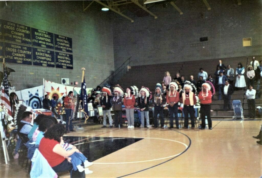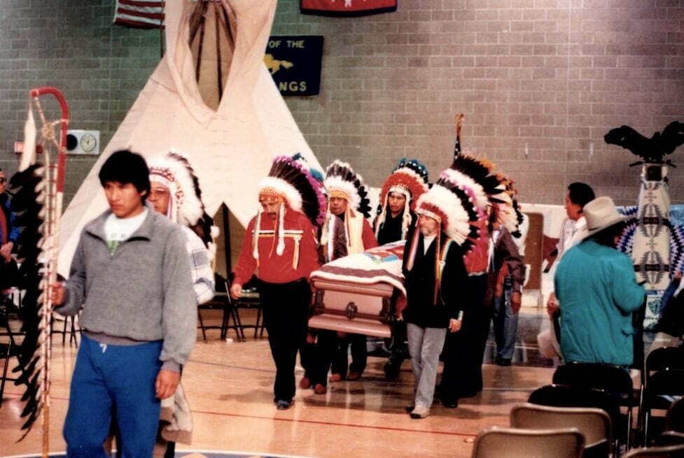 The Pall Bearers standing in prayers at Chief Fools Crow's funeral ceremony held at the gym of the Kyle School.