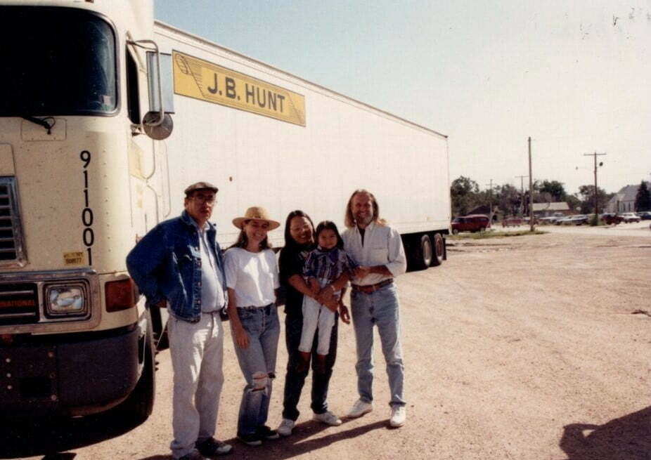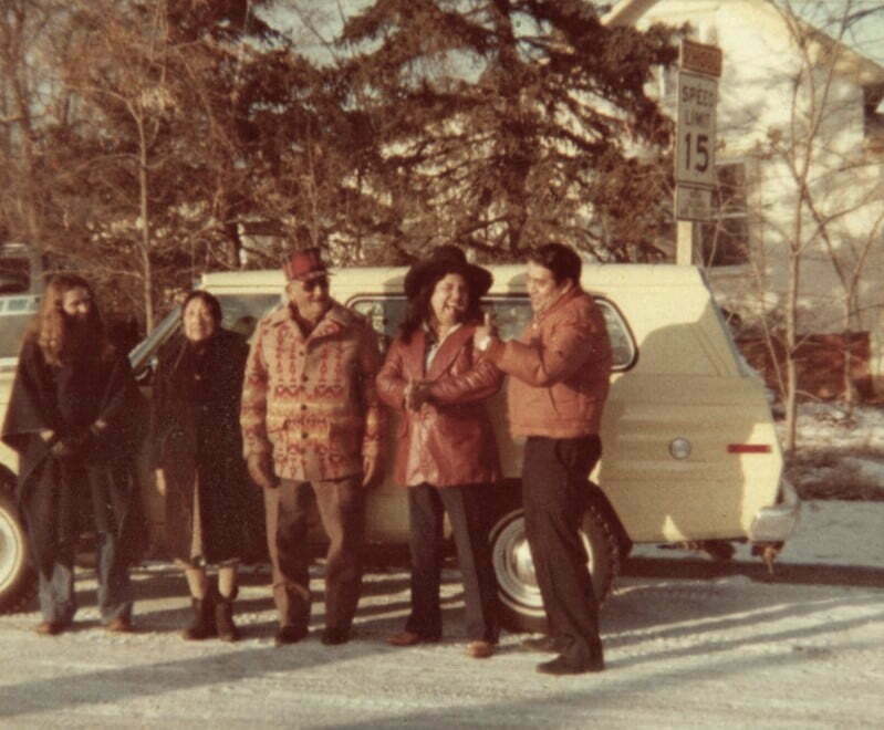 John Denver, Holmes Hendrix and my Foundation bought Grandpa Fools Crow a new 1979 Jeep. He and Grandma had no transportation. We hired a driver for them. In the picture: Dik, Grandma, Grandpa, Buddy Red Bow and Sonny Richards who was a medicine man who danced with Buddy in the first legal Sun Dance led by Chief Fools Crow.